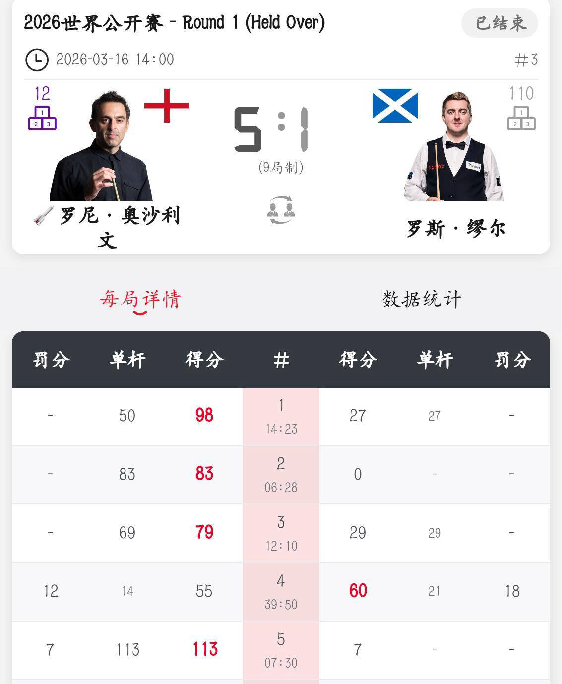 与此同时,在同一时间段结束的延期资格赛中,被誉为历史第一人的奥沙利文表现强劲,他接连上演精彩单杆得分,包括50分、83分、69分以及两杆破百的113分和114分,连赢三局,最终以5-1大胜罗斯缪尔。值得一提的是,由于正赛首轮对手查达因故退赛,奥沙利文顺利提前晋级32强,展现出绝佳的夺冠潜力。